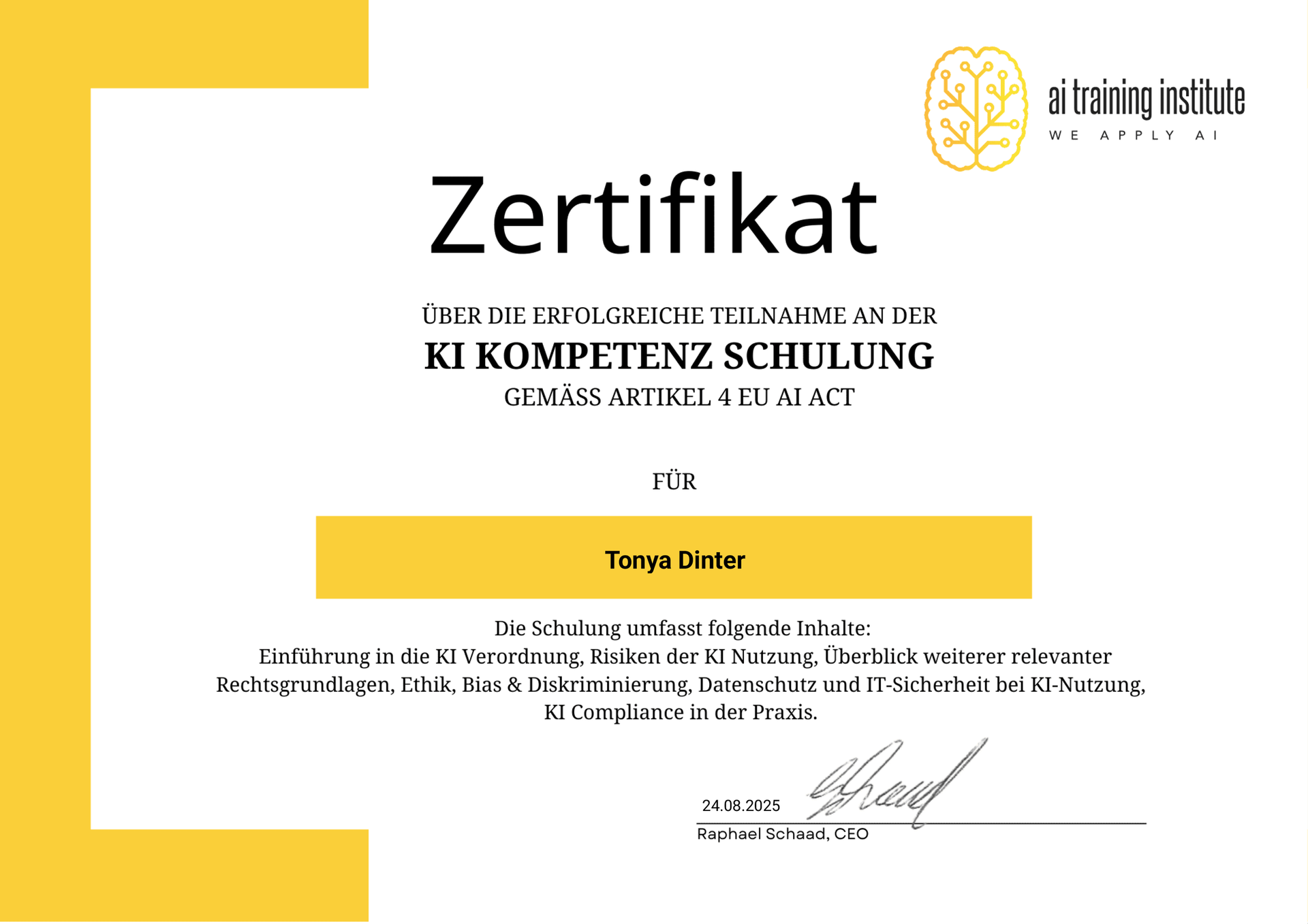 - Ich bin TÜV Rheinland zertifizierte AI-Trainerin – mein aktuelles Zertifikat ist bis 2027 gültig.